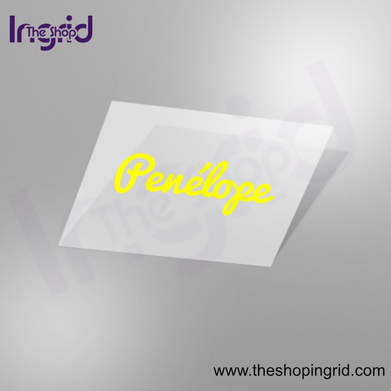 La pegatina con el nombre Penélope está disponible en varios colores de vinilo para adaptarse a diferentes gustos y estilos decorativos.